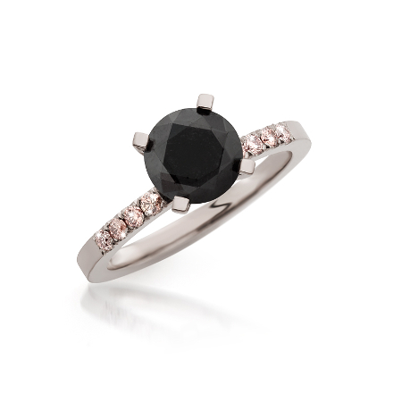012 - 18kt wit gouden verlovingsring bezet met een briljant geslepen zwarte diamant. Zijkanten bezet met 8 roze diamantjes. Ontwerp: Marleen Hengeveld - AMMA Sieraden