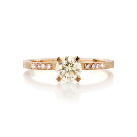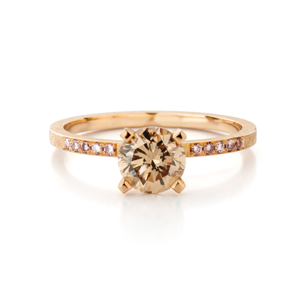 013 - 18kt rosé gouden verlovingsring bezet met een briljant geslepen Fancy Yellowish Brown diamant, HRD gecertificeerd. Zijkanten bezet met 10 roze diamantjes. Ontwerp: Marleen Hengeveld - AMMA Sieraden